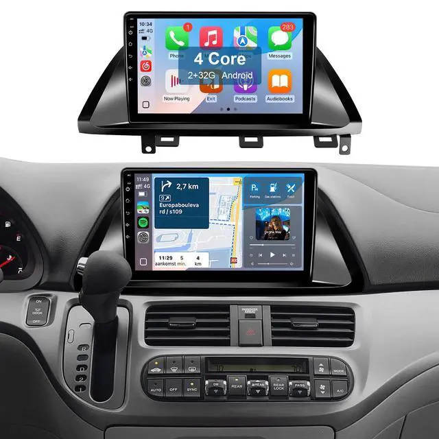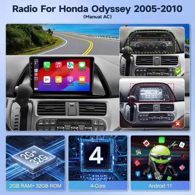 Car Radio for Honda Odyssey UpgradeThis double din radio for Honda Odyssey 2005-2010 bulit-in powerful Android 11, 4 core provides allowing you to quickly switch app without delay. Equipped with 2+32GB of ROM, you will have enough space to download and store all your favorite applications. (NoteNOT suitable for cars with j. b. l/BO-SE premium audio, OEM camera or large screen. Please check the model and year of your car, as well as the shape and size of the center console) ^^ CarPlay & Android Auto & MirrorLink For 2005 Honda Odyssey radio supports iPhone and Android phones, enjoying the convenience of wireless Carplay and Android Auto.