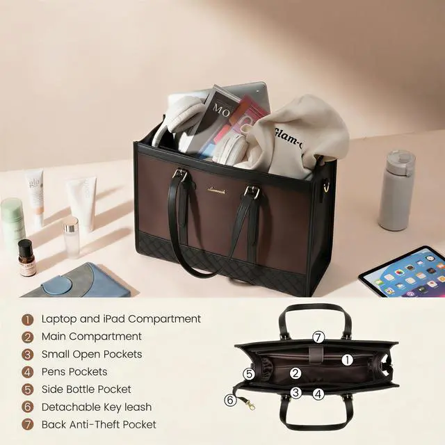 HIGH QUALITY PU & DURABLE Crafted from high-quality PUfaux leather, our laptop tote bag is built to withstand the test of time. Its sturdy construction and reinforced stitching ensure long-lasting durability, protecting your valuable laptop and belongings. ^^ LARGE CAPACITY & LAPTOP COMPARTMENT Size of womens laptop bag: 16.1" * 6.3" * 12.2". The dedicated laptop compartment provides maximum protection for your device. 2 inner pockets, 2 slip pockets, and 1 zipper pocket for small items such as a phone, wallet, makeup, passport, etc. ^^ COMFORTABLE AND CONVENIENT CARRYING The tote bag is designed with your comfort in mind. Detachable & reinforced stitching shoulder strap for durability, you can carry it as a crossbody bag, freeing your hands. Plus, the leather handle can adjust the length to fit different heights. ^^ COMPLIMENTARY CLUTCH BAG The clutch purse is compact enough to fit in your hand or easily slip into a larger bag, yet spacious enough to hold all your essentials, such as your phone, keys, cards, and makeup. ^^ VERSATILE AND PRACTICAL Built-in key hooks are perfect for keys or other accessories. The back pocket provides convenient storage space for your phone, wallet, and other small items! A side pocket in the bag is used to hold a water bottle or umbrella. The metal bottom nail makes our work shoulder bag wear and stain-proof.
