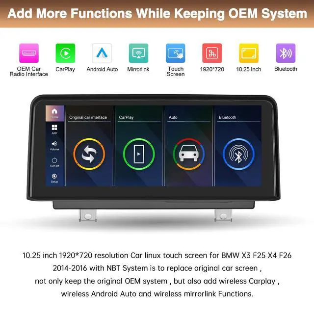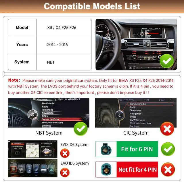 Pre-shopping NotesThe car touch screen for BMW X3 F25 X4 F26 2014-2016 with NBT System, Not fit for CCC and CIC System. Pls Confirm the system and car model to buy!!! If you are unsure, pls ask for help from us. ^^ 10.25 Inch 1920*720P Touch Screen Display With the display touch screen, high-resolution image quality. The HD display delivers outstanding clarity, contrast, and brightness. Catch every single sharp, vivid, and vibrant picture from virtually any vantage point; It supports AHD 720P/CVBS NTSC/PAL camera.
