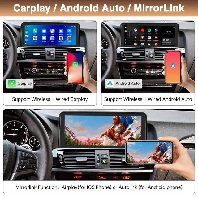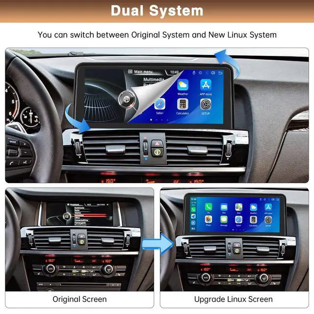 ^^ Car Touch Screen Built-in Wireless/Wired CarPlay and Android AutoUse your phone in safety while you drive. By simply saying "Hey Siri" or "OK Google", to get directions, make calls, send & receive messages, and enjoy your favorite music. Get access to voice commands, Siri & Google Assistant can help you do all of these things. ^^ Dual Systems for CarNot only retain the original OEM system functions, but also add wireless Carplay, Android Auto and mirrorlink Functions. One-click Dual-system Switch Seamlessly switch between Linux and original car systems.