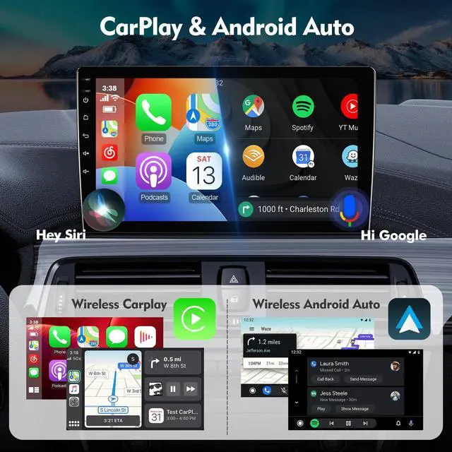 The wireless connection to CarPlay has lower latency and is more stable. Enjoy wired CarPlay and Android Auto functionality on this Android car stereo. Access calls, messages, and music seamlessly. You can even wake up Siri for voice control. ^^ Bluetooth 5.4 Car Stereo with FM RadioStay hands-free and distraction-free with the Bluetooth functionality of this car stereo. It has a built-in clear microphone for answering and making calls. The Bluetooth wireless audio streaming allows for a superior music listening experience. Additionally, the FM radio has 18 preset stations, so you can tune in to your favorite programs anytime.