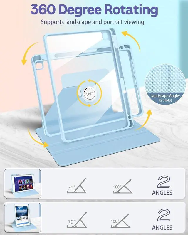 Degree Rotating Stand: This case features an advanced Rotating Stand design, allowing you to effortlessly adjust between landscape and portrait orientations for a full range of viewing and usage possibilities. Provide you comfortable viewing and typing experiences ^^