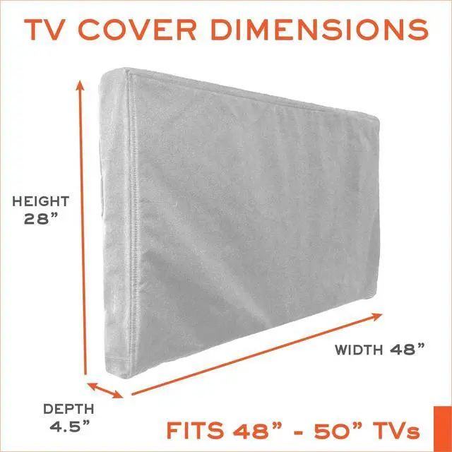 WEATHERPROOF, HIGH QUALITY MATERIAL This Outdoor TV cover is made of heavy-duty 600D Oxford material with polyester backing and soft interior. The TV cover will keep your TV safe from any weather including rain, dust, sand, snow and extend the life of your outdoor TV. ^^ WRAP-AROUND COVERAGE - Provide 360 degrees protection for your TV outside. Quality zipper prevents water intrusion and fasteners on the back completely seal your TV. ^^ DIMENSIONS OF 48-50