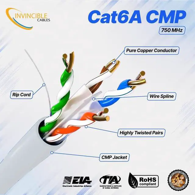 ^^ -: Our Cat6A plenum-rated Ethernet cable is constructed with 100% solid copper conductors for enhanced durability and conductivity. It ensures adherence to ANSI/TIA 568.2 -D standards, is RoHS-3 compliant, and is backed by a FOREVER WARRANTY, providing you with peace of mind and a solid investment in your networking infrastructure. ^^ - - -,: Simplify your installation process with our Cat6A plenum-rated Ethernet cable, packaged in a tangle-free, easy pull box. Featuring easily identifiable color-striped 4-pair UTP (Unshielded Twisted Pair) solid copper conductors and sequential footage markings, this cable ensures precise usage tracking and smooth, flexible installation in any setting.