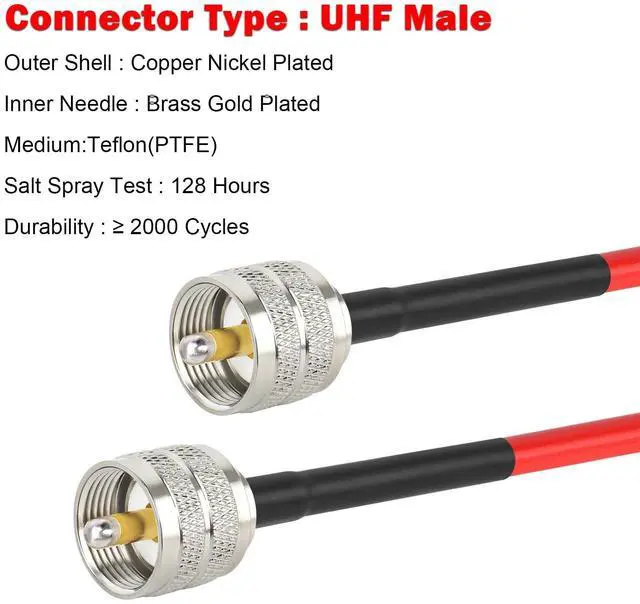 • Premium Materials -- The inner conductor of this cb coax cable is made of solid copper,outer conductor is made of Aluminum foil and tinned copper braid which can maximum protect the signal over large distance.Durable PVC jacket allows the pl259 cable exposure in outdoor harsh environments.