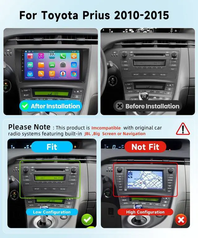• For Toyota Prius Basic version Radio : This car radio is only suitable for Toyota Prius Basic version 2010 2011 2012 2013 2014 2015. Please note that it does not fit the original large screen or JBL or car radio with navigation shown in the picture above