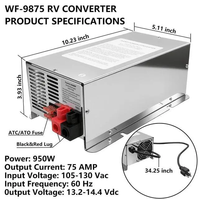 Excellent compatibilityWF-9875 is a multifunctional, safe, and advanced 75 ampere power converter widely used in RVs, cars, boats, caravans, trailers, campers, or any application that requires battery charging or 12V power. Suitable for AGM, lead-acid, and lithium batteries. Providing a 75 ampere accurate, clean, efficient, and reliable DC power supply without the need for battery filtering, it is an ideal power solution for solving various electronic devices and electrical power supply problems. ^^ High tech standardsThe manufacturing of each component exceeds OEM specifications, and through precise design and testing, it can directly and reliably replace WF-9875, WF-9875-AD, WF-9865-AD-CB, WF-9875-MBA, WF-9877-LIS, and all WF-9800 series power converters.