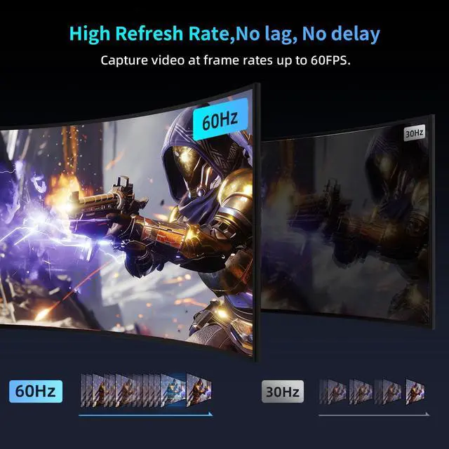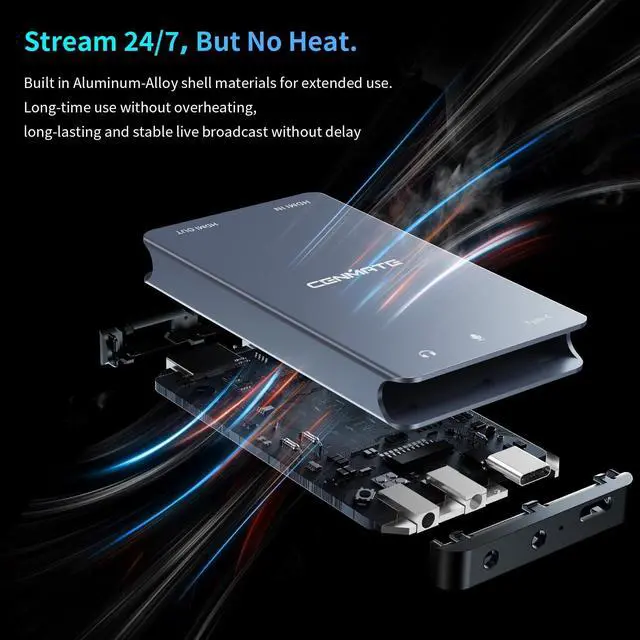 4K@60Hz Input & Loop-outThe Audio Video Capture Card has maximum HDMI input & pass-through resolution up to 4K@60Hz, and streams 1080p@60fps video signal through USB C 3.0 port. Audio and Video are syncd and colors are sharp. Record your moments to your heart's content. ^^ 1080P 60FPS HDMI Video CaptureThe hdmi video capture captures video sources with resolutions up to 1080p at 60fps. It outputs excellent image quality that is clean, crisp, and free of frame lag. Enjoy recording the exciting moments of your gaming adventures. ^^ Stream 24/7, But No HeatBuilt in Aluminum-Alloy shell materials for extended use.