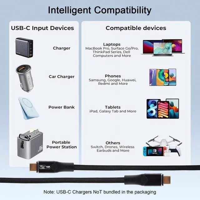 ^^ 240W High-Speed Charging & PD 3.1 CompatibilityPower up your devices faster with the Thunderbolt 5 Cable, featuring 240W Power Delivery and PD 3.1 compatibility. Fully charge a MacBook Pro in just 1 hour, and enjoy backward compatibility with Thunderbolt 4 Cable and USB-C devices. ^^ Premium Durability & Tangle-Free DesignBuilt with a reinforced nylon braided jacket and tinned copper core, this Thunderbolt Cable resists corrosion, wear, and tangling. Tested for 10, 000+ bends and extreme temperatures (-20C to 60C), its built to last. ^^ Universal Compatibility & Future-Proof PerformanceThe Thunderbolt 5 Cable is fully compatible with Thunderbolt 4, Thunderbolt 5, USB4, and USB-C devices, including MacBook M4 Pro, iPhone 16/15 Pro, Dell XPS, Lenovo, and more.