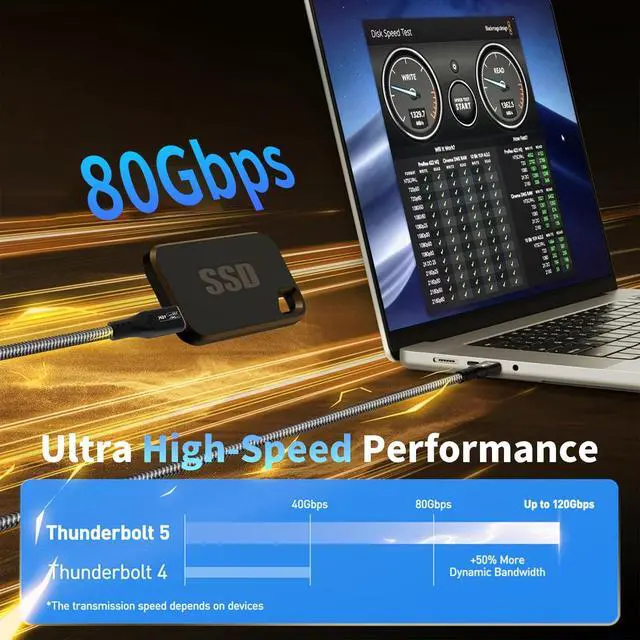 120Gbps High Speed and EfficiencyWith a display transmission bandwidth of up to 120 Gbbps, Thunderbolt 5 Cable offers 80 Gbps bidirectional bandwidth, 3 times faster than Thunderbolt 4 and previous USB4 (40 Gbps bandwidth). Perfect for professionals transferring large files, 4K/8K videos, or complex 3D models with minimal wait times. ^^ 16K Ultra-HD & Dual 8K Display SupportElevate your visual experience with the Thunderbolt 5 Cable, supporting 16K@60Hz resolution and dual 8K/6K or triple 4K@144Hz displays. Ideal for graphic designers, video editors, and gamers who demand precise color accuracy and ultra-smooth visuals.