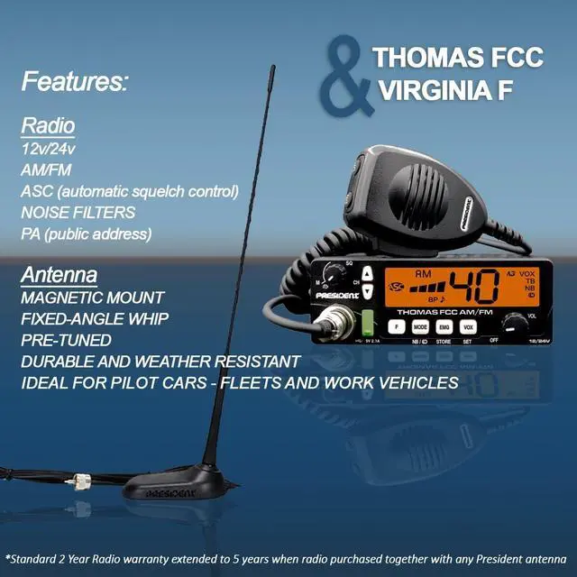 Stay connected and in control with the President CB Radio Heavy Duty (HD) Kit, engineered for demanding jobsite conditions. This all-in-one bundle includes the President Thomas FCC 40-Channel AM/FM CB Radio, known for its rugged build and crystal-clear transmission, paired with the Virginia F Magnet-Mount Antenna for fast, secure setup on any magnetic metal surface. Whether you are managing a construction crew, operating heavy machinery, or coordinating logistics across a large site, this kit delivers dependable communication when it matters most. With support for both 12V and 24V systems, it's compatible with a wide range of vehicles from pickup trucks to excavators.