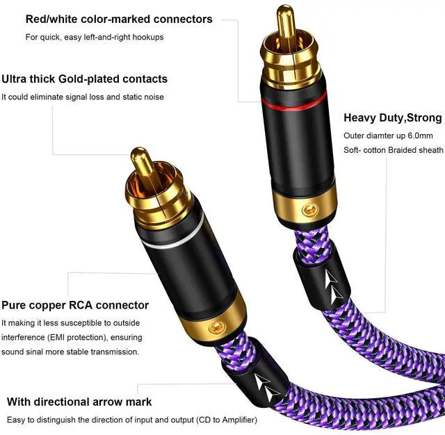More durable than standard RCA cables ^^ Luxury Aesthetic & Practical DesignElegant purple braided exterior complements high-end audio gear, with color-coded RCA heads (red/white) for foolproof setup. Tangle-free flexibility simplifies cable management in tight spaces ^^ Universal Plug & Play Compatibility Seamlessly connects turntables, subwoofers, receivers, mixers, and DVD players with RCA L/R ports. 2.5 ft/3ft/6ft/10ft options fit any room layout. Gold-contact warranty ensures lifelong pristine signal transfer