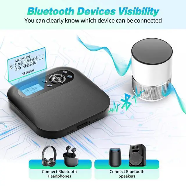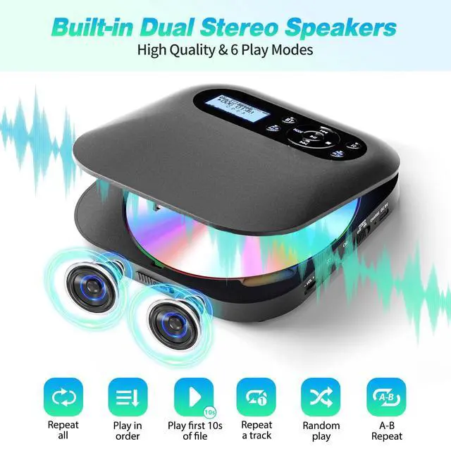 Multi-functional CD PlayerDesobry Bluetooth cd player has: Bluetooth transmitter, dual loud speakers, 6 playing modes, 5 sound effect, A-B repeat, REC record function, luminous buttons and double headphone jacks. This portable CD player is built-in FM transmitter that can be paired with the car via FM frequency, which achieves a wireless connection to play CDs in the car. ^^ CD Player with SpeakersThis portable cd player is designed with duel stereo speakers. You can listen to CD/Audiobooks through its speakers, so you don't need to wear headphones all the time. You can use this cd player in 4 ways: Bluetooth, Speakers, Headphone, aux connect to external speakers / cars. Great sound quality for you enjoying music. ^^ Bluetooth CD PlayerOur cd player with bluetooth 5.1 and use dot matrix text, so it can shows the connectable devices. You can more easily connect with the Bluetooth earphones or speakers you want. If you want to use it in car, you can connect with AUX cable or FM TX function.