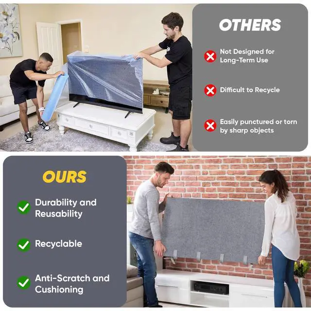 The straps design effectively prevents the cover from shifting, providing stable protection for the screen and avoiding the risk of scratches during transportation ^^ Eco-Safe & Reusable - It is made of soft and lightweight material. It can be easily folded and stored after use. It is small and does not take up space. It is convenient to store in a storage cabinet or carry with you. It meets the portable storage needs after use and can be reused many times ^^ Widely Used - The TV moving cover can be used to protect the screen during moving, dustproof packaging during renovations, and everyday pet protection.