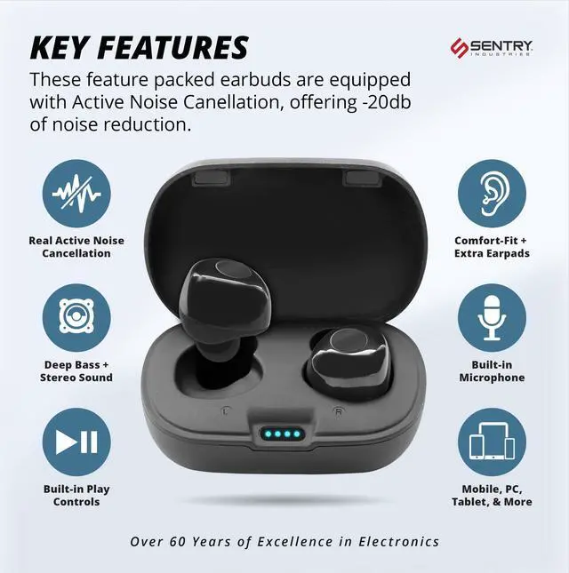 The Sentry Dots Active Noise Cancellation Bluetooth Earbuds are a premium noise cancelling earbud with up to -20dB of Noise Reduction with a portable charging case and a USB C charging cable included. Audio controls and a microphone are built into the earbud. The audio controller uses a button to quickly access your devices audio. These earbuds are easy to pair via Bluetooth and require no app to use. Extra earpads are included to find the perfect fit for you. With up to 18 hours of playtime the Sentry Dots are a great choice for on-the-go listening.