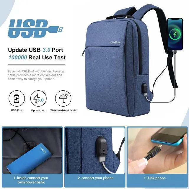 It's a great tech gift for him from wife, daughter and son. Please noted that this backpack doesn't power itself, the USB charging port only offers easy access to charge. When clean the backpack, remove the USB charging line. ^^ WATER-RESISTANT & DURABLE MATERIALMade of Water Resistant Fabric and Durable metal zippers. Ensure secure & long-lasting usage everyday & weekend. Serve you well as a professional office work bag, slim USB charging bagpack, college backpack for mens and womens. ^^ CONVENIENT STORAGELaptop backpacks front side zipper pockets, easy for holding a water bottle, readers and a bunch of other items, iPad, journal, pens and pencils, iPhone.