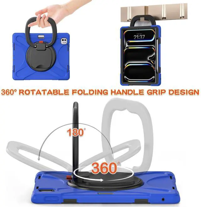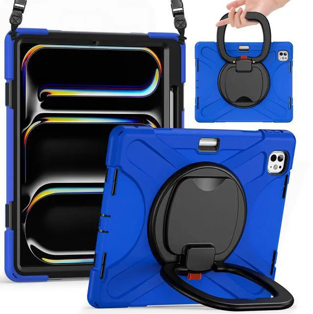 Batianda for iPad Pro 13 inch Case (2024) M4 Chip Model A2925/A2926 Heavy Duty Rugged Durability Silicone Tablet Cover with 360deg Rotating Ring Foldable Kickstand & Shoulder Strap, Blue