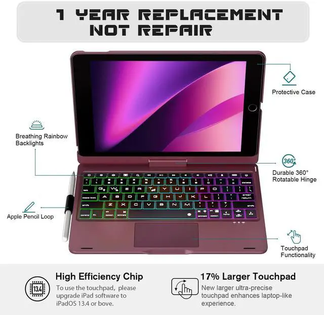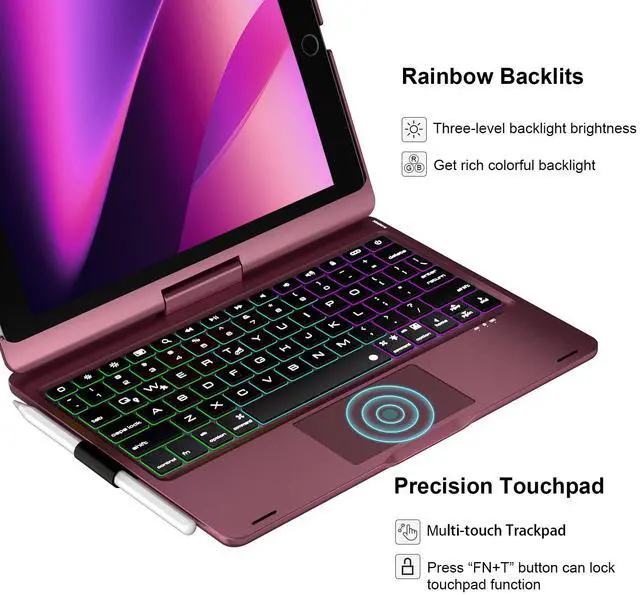 BABG Keyboard Case for iPad 9th Generation, 360deg Rotatable Backlit Keyboard with Pencil Holder for 10.2 inch iPad 9th Gen 2021/ 8th Gen 2020/ 7th Gen 2019 and iPad Air 3 / Pro 10.5" - Raspberry
