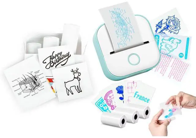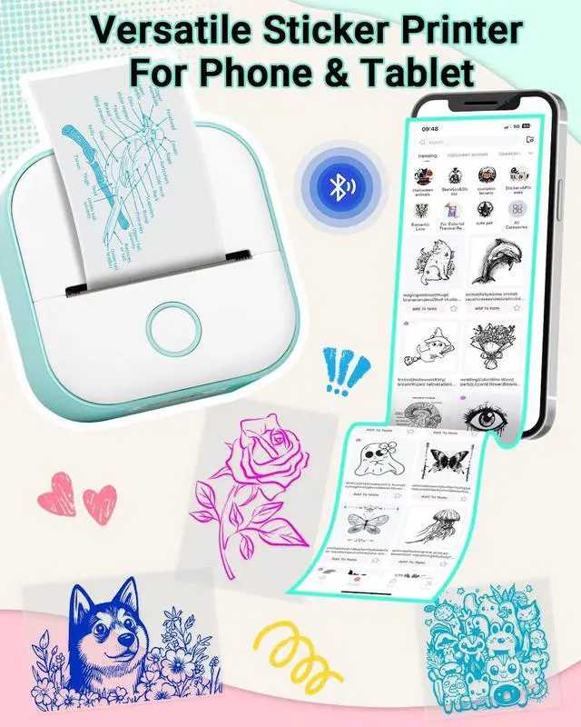 Mini Inkless Printer: Memoking T02 pocket printer is thermal printer, you can print directly with Memoking T02 sticker paper without any ink. T02 sticker maker is not only for sticky or non-sticky white thermal paper, but also for color and clear transparent sticker printer paper