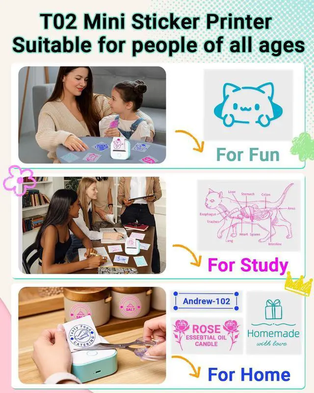 Sticky Note Printer for All-Stage Students: Memoking T02 sticker maker is for printing study notes, anatomy flashcards, graphic diagrams for math, chemistry, geography, physics and excerpts. Mini sticker printer machine helps students save time. Use "Scan" function to print study graphics clearly