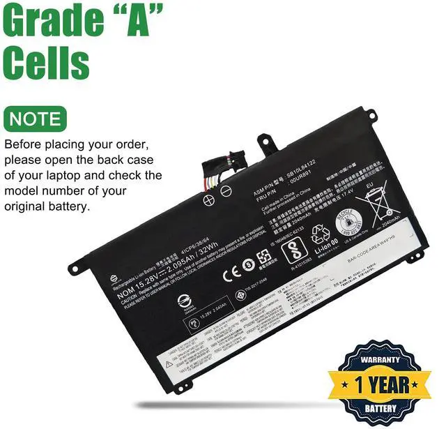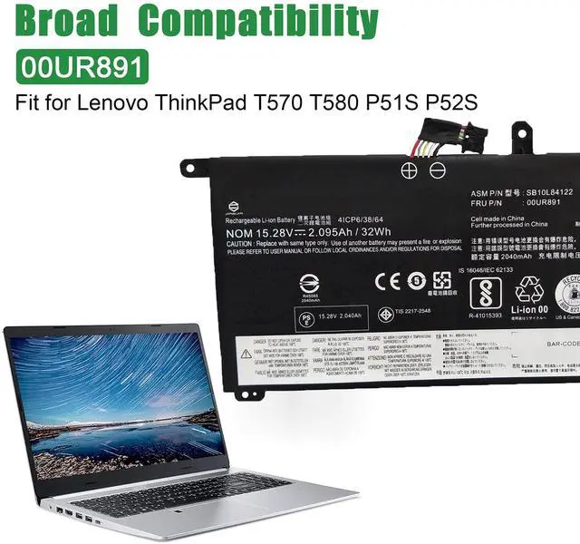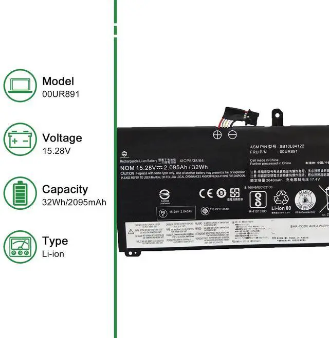 • Model: 00UR891 // Voltage: 15.28V // Capacity: 32Wh 2095mAh // Color: Black // Type: Plug & Play Li-ion Battery.