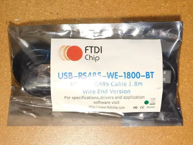 The USB RS485 WE 1800 BT from FTDI is an USB to UART cable with RS485 level UART signals. It corporate FTDI's FT232RQ USB to serial UART interface IC which handles all USB signalling and protocols. The cable provides a fast, simple way to connect devices with RS485 interface to USB. It contains small internal electronic circuit board utilising the FT232R which is encapsulated into USB connector at one end of cable. The other end of the cable is bare, tinned wire ended connections. The integrated electronics also include RS485 transceiver, Tx and Rx LEDs which give a visual indication of traffic on cable.