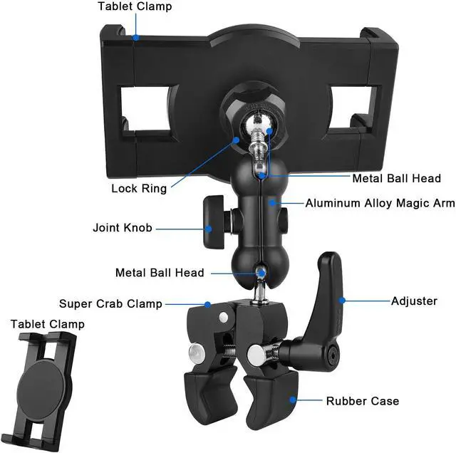 [(Sturdy & Anti-scratch)] :Tablet mount arm are made up of super crab clamp and articulating magic arm,both of them are aluminum alloy and stainless steel material,sturdy,durable,super crab clamp built-in rubber pad to anti-scratch,clamped the pole tightly,tablet clamp is high quality of ABS material,clamp feet built- in rubber pad to hold iPad firmly.