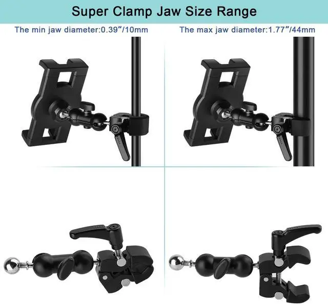 [(Adjustable Jaw)] : Super crab clamp adjustable jaw diameter is 1.77 inch/45mm,the tablet mount arm can be clamped rod of diameter 1.57 inch / 40mm (like pipes, tripods,desks, handlebars) etc,suitable for stroller,treadmill,elliptical,spin bike,shopping