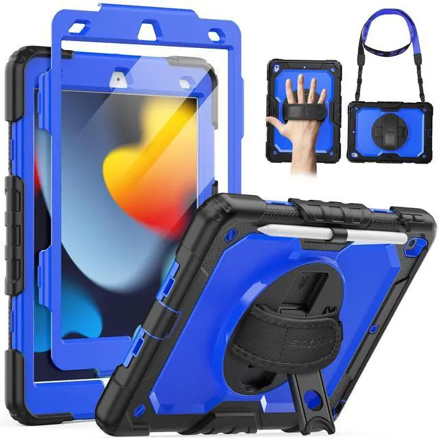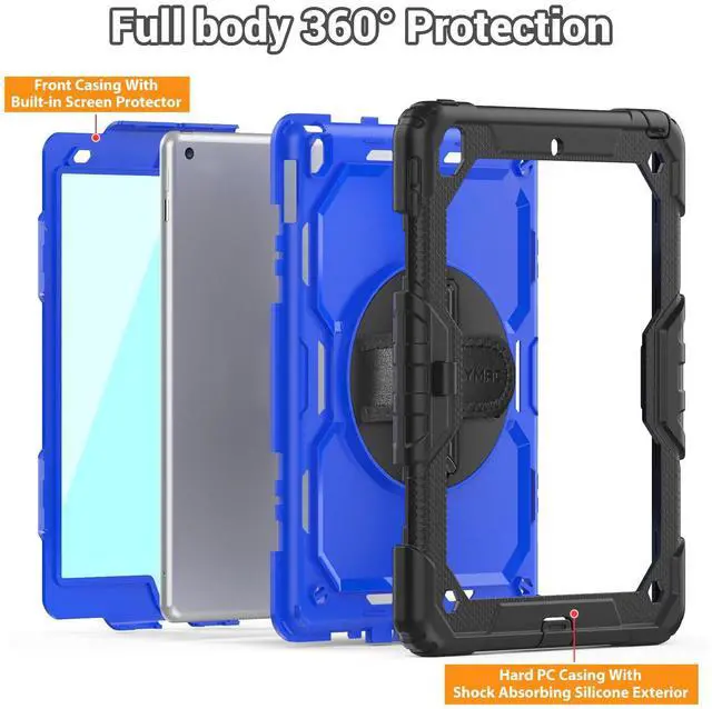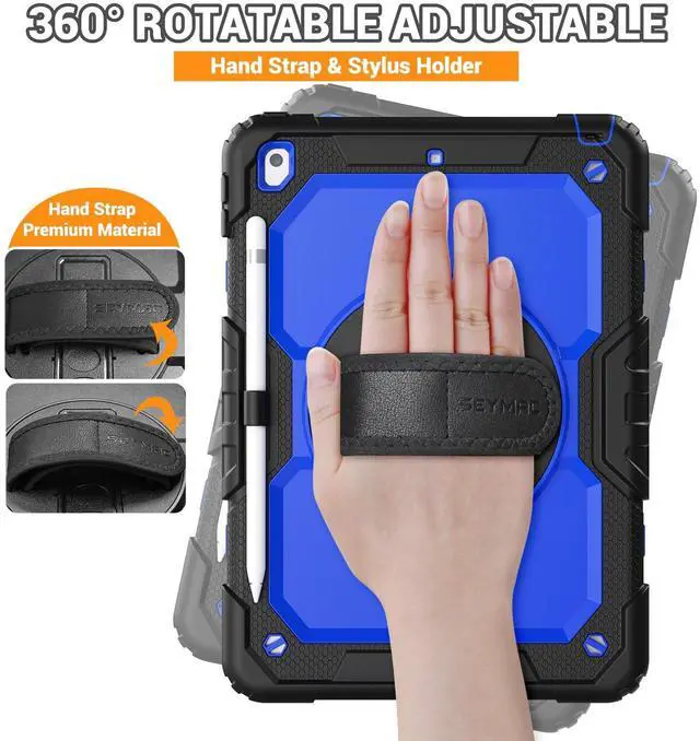 SEYMAC for iPad 9th/8th/7th Generation Case 10.2" 2021-2019, Full-Body Shockproof Heavy Duty Protective Case with Screen Protector, Rotating Stand/Handle/Shoulder Strap for iPad 10.2, Black/Blue