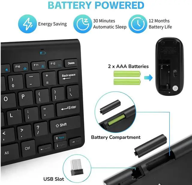 [COMPACT AND POWER SAVING] - The keyboard and mouse are compact and designed to save power. The keyboard automatically sleeps after 3 seconds of no operation, while the mouse sleeps after 10 minutes.