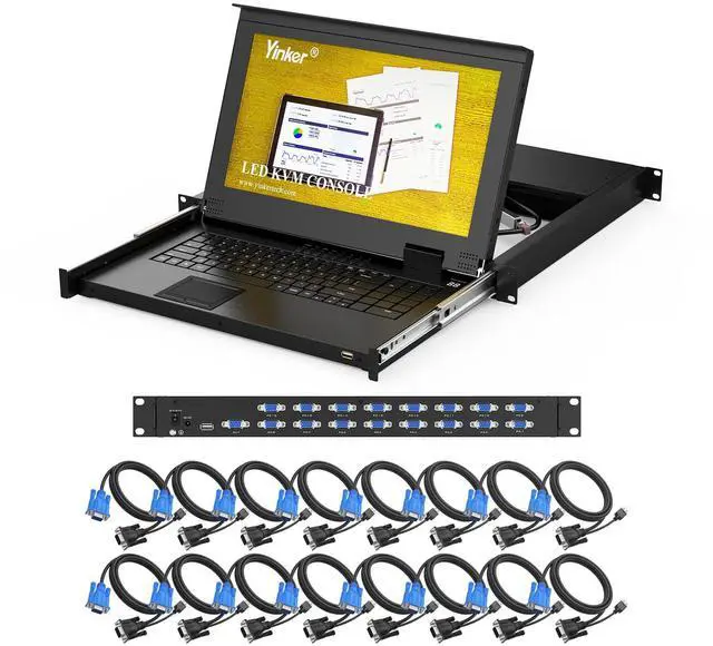 Yinker 16 Port Rack Mount KVM Switch, with integrated 15.6 inch LCD monitor, US keyboard and touchpad, allows manage and control 16 computers or servers.