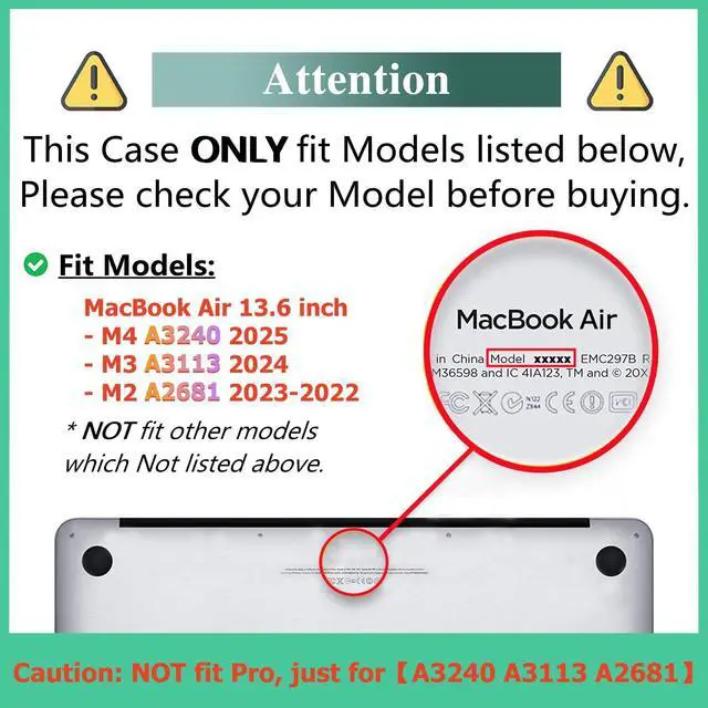 CHECK YOUR MODEL: This case is NOT Compatible With MacBook Pro or other model laptops. Please Kindly check the Model Number on the bottom of your Mac Air before purchasing, make sure it's exactly same with "A3240" or "A3113" or "A2681" which is compatible with MacBook Air 13 inch M4 Case & compatible with MacBook Air 13 inch M3 case & compatible with MacBook Air 13 inch M2 case