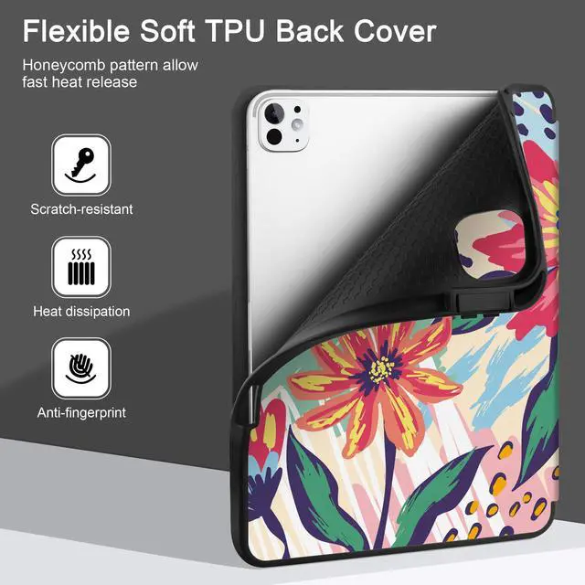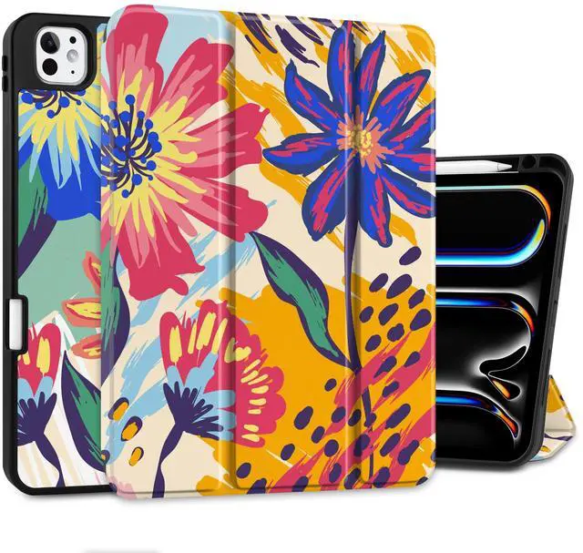 MEEgoodo Case for M4 iPad Pro 11 inch Case 2024, Tablet Cover with Trifold Stand & Pencil Holder & Auto Wake/Sleep & Soft TPU Back Cover, Art Painted Flowers