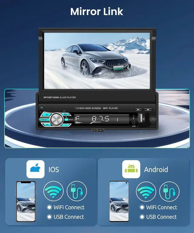 Mirror Link Function 1 din touch screen radio support Android/ IOS phone mirror link, synchronize mobile screen to the car stereo screen. IOS one-way: iOS supports mobile phone one-way projection to the machine; Android two-way: Android supports mobile phone two-way connection.