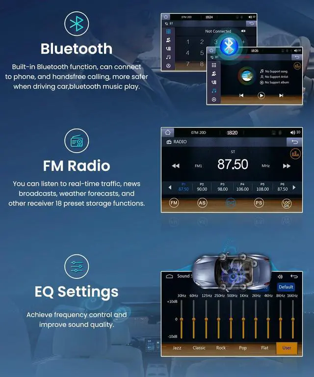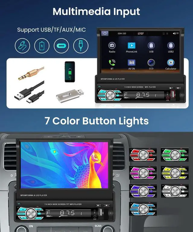 FM Radio & BluetoothSingle din 7 inch car MP5 player support hands-free calling, phonebook calling records download, audio stream music. Built-in microphone, making your call more clear. 1 din radio with high-quality stereo, which can search channels in full-automatic ways, semiautomatic way and accurate adjustment way.