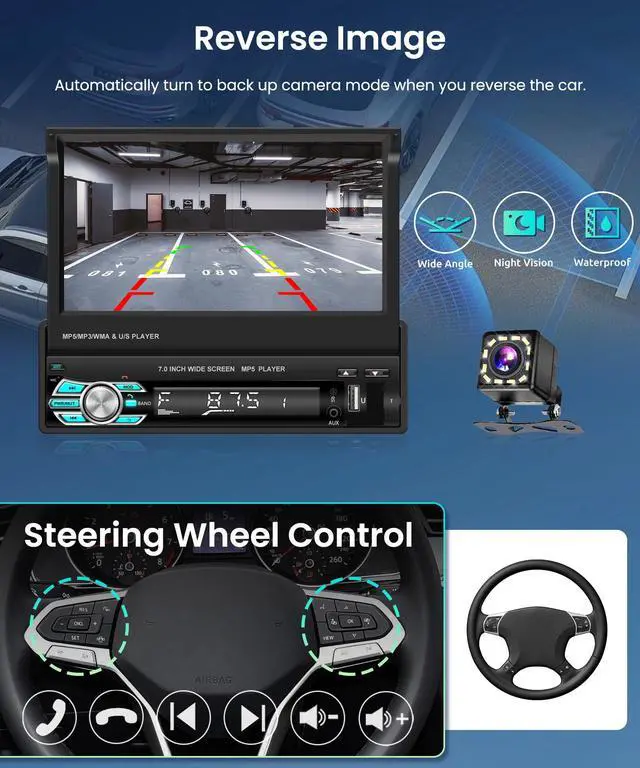 Backup Camera Input & Steering Wheel ControlSingle Din Flip out Car radio with backup camera, connect to a car