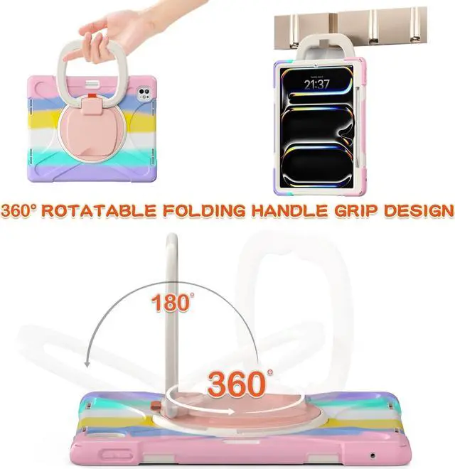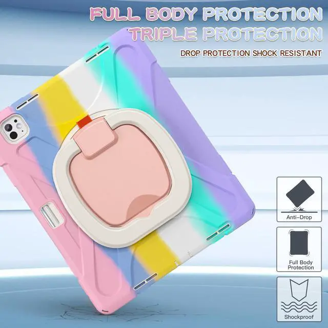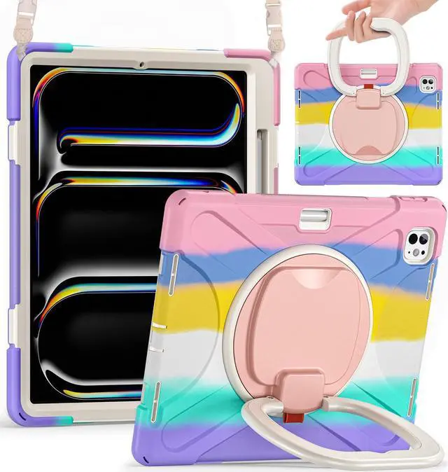 Batianda for iPad Pro 13-inch Case (2024) M4 Chip Model A2925 Heavy Duty Rugged Durability Silicone Tablet Cover with 360° Rotating Ring Foldable Kickstand & Shoulder Strap, Colorful Pink