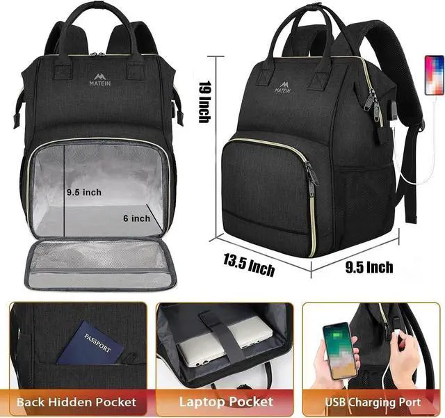 Insulated & Leakproof Cooler Funtion: Size: 19x13.5x9.5 inch. Large lunch backpack with high quality insulation layer of lunch box compartment keeps food fresh and warm for about 2-4 hours, which makes it easy to clean and store food. MATEIN travel laptop backpack cooler lunch bag is suitable for women work, college, beach, office, picnic, trip, travel, camping (Please check your 17.3 Inch laptop's size before purchasing)