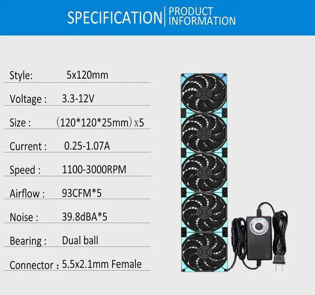 STEPLESS CONTROLLER: Small 120mmx5 computer fans with speed controller,wide range of speed choice,you can easily adjust the speed from silent(1000rpm) to high speed(3000rpm) according to different applications.
