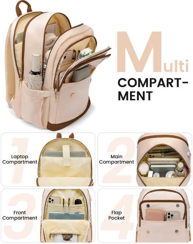 Eazy Organization & Superb Protection With a three-layered structure and an array of compartments, our travel backpack for women offers unparalleled organization. The laptop compartment boasts extra padding to keep your device secure. Plus, the spacious main compartment holds three days' worth of clothing. Additional pockets include side pockets, a front compartment, and a flap pocket that provides easy access to your essentials.