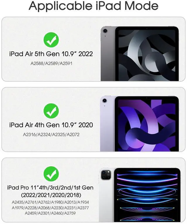 Compatibility:Lightweight and shockproof case for Air 5th/4th generation 10.9 inch 2022 /2020 & Pro 11 inch 4th /3rd /2nd /1st 2022 /2021 /2020 /2018 [MODEL:A2589 /A2591 /A1980 /A2013 /A1934 /A1979 /A2228 /A2759 /A2435 /A2761 /A2762 /A2301 /A2377 /A2459 /A2460] Please note:Not include pencil and Not suitable for iPad pro 11" M3 2024