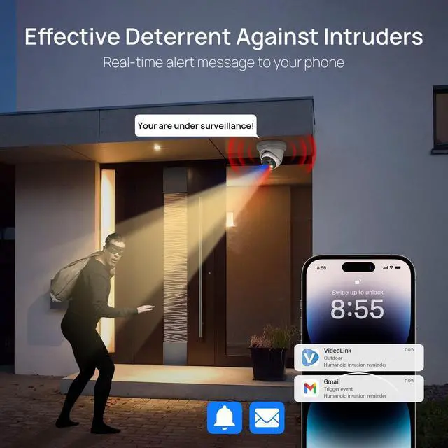 Tioc 2.0 & Smart Human/Vehicle Active DeterrentThis 4k full color ip camera is equipped with Tioc 2.0 active deterrent technology (Siren, Red & Blue Strobe Light), which flashes red and blue lights and audible alerts to scare off intruders when an alarming object is detected, and also features AI human/vehicle detection technology. 4k ip poe camera has a built-in speaker and mic, support 2 way audio , allowing you to hear the people in front of the camera no matter where you are. (TipsThe Two Way Audio Function will Not Works While Connected with Other NVR Except The VIKYLIN NVR)