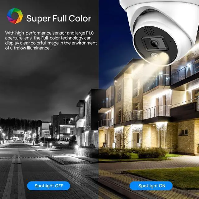 8MP 4K Color Night Vision PoE CameraThis 8mp poe ip turret camera has with excellent full-color technology and F1.0 large aperture lens. Ultra HD 8MP resolution (3840x2160@20fps)featuring the latest CMOS1/2.8" image sensor, 2.8mm fixed lens provides 112° ultra-wide viewing angle to let you enjoy 98ft full color night vision even in total darkness.