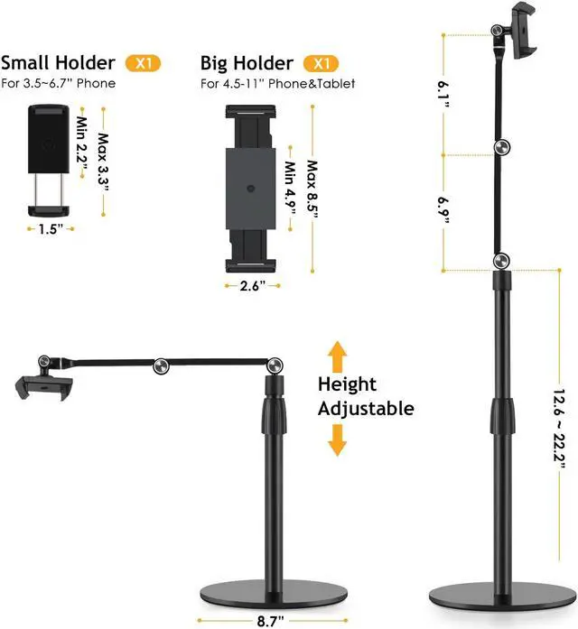 Universal Fit: The overhead phone recording stand features dual holders that support devices from 3.5 to 11 inches, perfect for teaching, displaying documents, live broadcasting, video recording, and daily tasks.