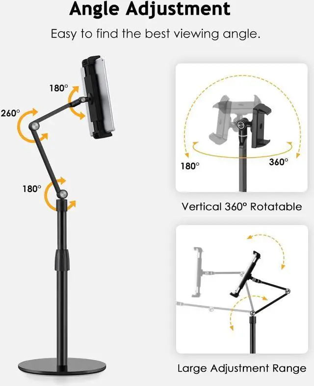 Ergonomic Flexibility: The overhead phone stand offers adjustable height and 360-degree swivel for the perfect viewing angle. The height adjusts up to 9.8 inches, and the arm extends up to 13 inches, reducing neck, shoulder, and back strain.