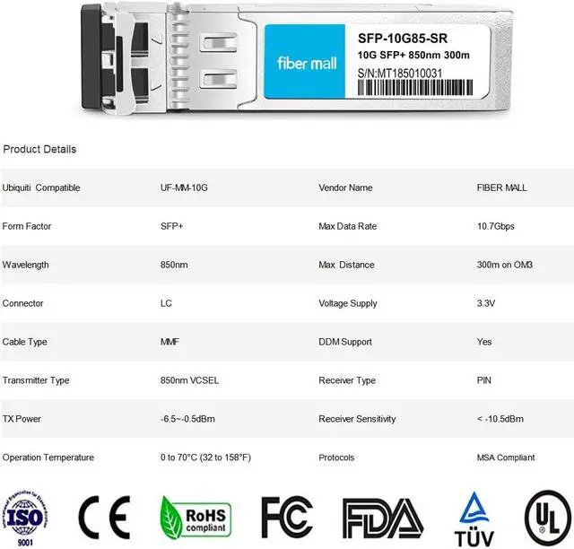 10GBase-SR SFP transceivers modules supporting data rate of 10.3Gbps and 300m compatible with SFP Multi-Source Agreement and SFF-8472 digital diagnostics functions.Compliant MSA Compliant