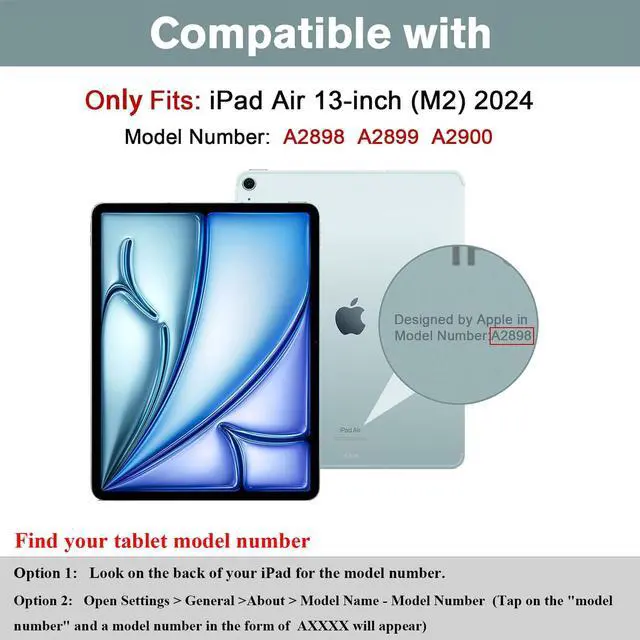 • Compatible Models: Exclusively designed for iPad Air 13 inch M3 (2025 release), (Model Number: A3268 A3269 A3271); for iPad Air 13 inch M2 (2024), (Model: A2898 A2899 A2900); Please double check your model, wrong model can not fit well; NOT for other tablet model. (with a random color stylus pen and cleaning cloth)