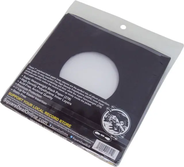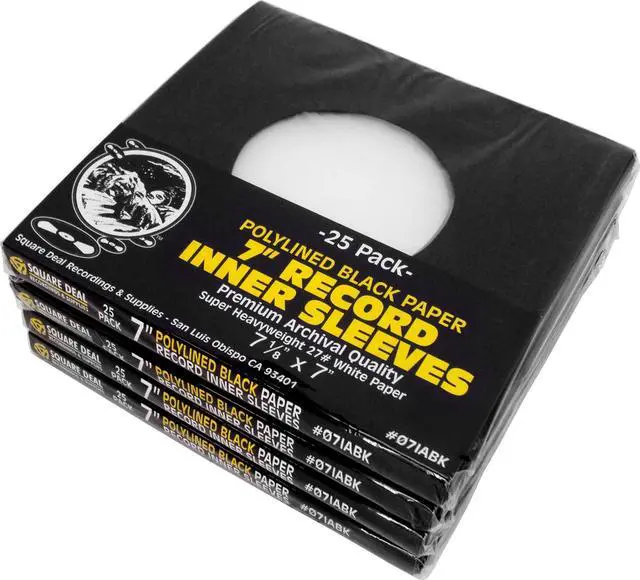 These 7" polylined black paper inner sleeves are the perfect mix of album protection and rigidity for easy insertion! The High Density Polyethylene (HDPE) inner layer protects your vinyl from scratching and dust, while the super heavyweight (27#) paper exterior makes the record stand up nicely inside the jacket. Archival Quality, Acid-Free, Static Free - PREMIUM PROTECTION for your 7" Vinyl Records. Exterior Flaps, and 1/4" Lip Allow for Easy Record Insertion. Each Sleeve Measures 7-1/8" wide by 7" tall - the perfect fit! This listing is for 100 individual sleeves.