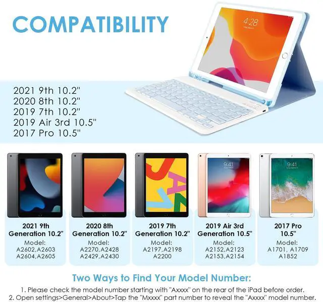 [Keyboard Case with Wide Compatibility]: LAMA keyboard case is designed for 10.2 inch and 10.5 inch iPad, the iPad 9th 2021 (A2602/A2603/A2604/A2605),2020 iPad 8th generation (A2270/A2428/A2429/A2430) / iPad 7th generation 10.2 inch 2019 (A2197/A2198/A2200), iPad Air 3 2019 (A2152/A2123/A2153/A2154), iPad Pro 10.5 inch 2017 (A1701/A1709/A1852). NOTE: Please check the "Axxxx" logo on the rear of the iPad before ordering.