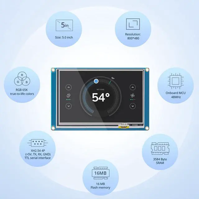 Easy to Use: Nextion HMI display connects to peripheral MCU via TTL Serial (5V, TX, RX, GND) to provide event notifications that peripheral MCU can act on, the peripheral MCU can easily update progress, and status back to Nextion display utilizing simple ASCII text-based instructions.